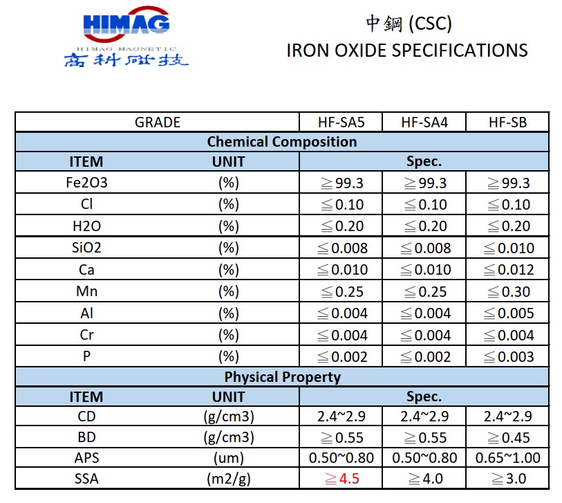 Iron oxide is an environmentally friendly product that produced through the acid solution recovery and regeneration process. The iron oxide that China Steel Corporation (CSC) produces has high stability and purity which can be used widely in magnetic materials. Himag is the exclusive authorized company to sell.